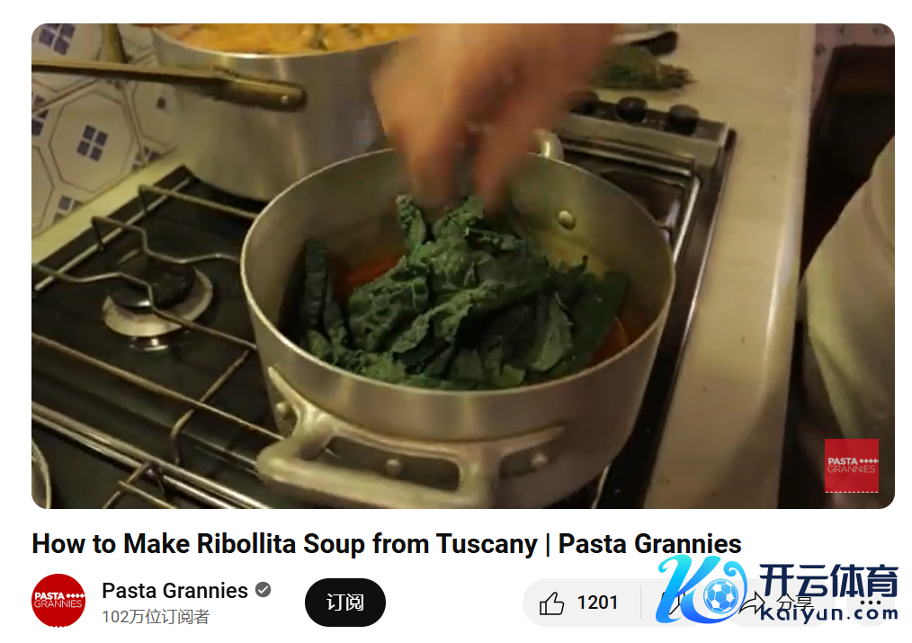 在托斯卡纳炖菜的制作历程中加入皱皮菜|图源:YouTube视频截图